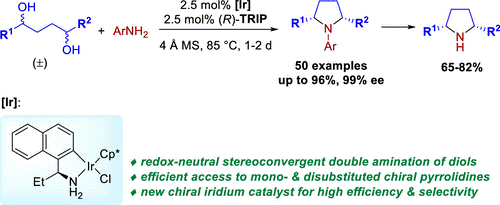 手性氮杂环广泛存在于药物和生物活性分子中,发展高效、高选择性合成这类化合物的方法一直是有机合成化学中备受关注的课题。suncitygroup太阳新城刘勇兵教授与新加坡国立大学/天津大学-新加坡国立大学福州联合公司研究人员利用借氢策略,通过手性催化剂的发展,首次实现了简单易得外消旋1,4-二醇和胺的直接高对映选择性环化。在该反应中,外消旋1,4-二醇经连续两次催化脱氢/缩合/还原过程转化为高附加值手性吡咯烷产物。整个反应过程无需外加氧化剂和还原剂,唯一副产物是水,原子经济性高,所得手性吡咯烷产物在药物开发和不对称催化领域有着广泛应用。该方法解决了手性氮杂环传统合成方法中需要使用光学纯手性原料(如手性二醇)及复杂多步合成问题,为手性杂环的合成提供了一个简单高效的方法。
