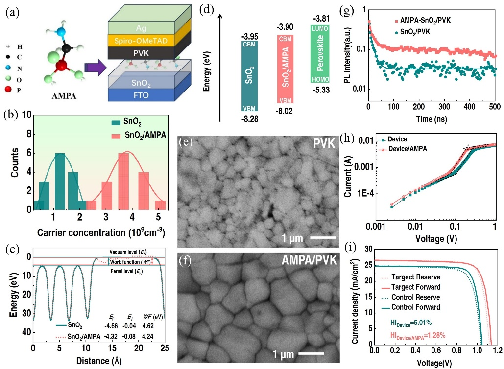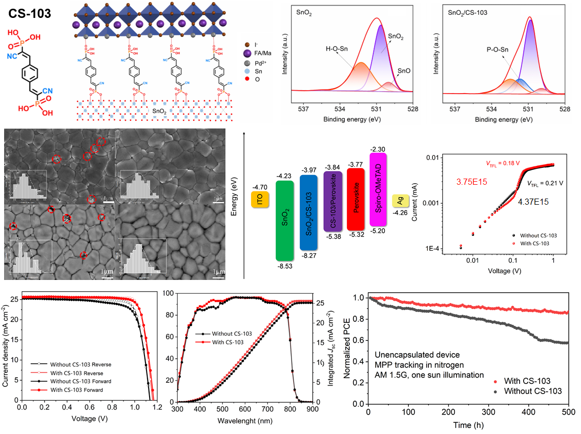 武明星教授课题组提出了一种有机小分子膦酸(AMPA)作为SnO2溶胶添加剂有效修饰SnO2电子传输层、钙钛矿层以及SnO2/钙钛矿界面协同策略。研究结果表明SnO2内部的AMPA通过与SnO2相互作用,降低了氧空位缺陷并提高SnO2的结晶度和载流子传输能力,有效抑制了SnO2电子传输层的载流子复合。此外,AMPA修饰有效提升了SnO2导带(CB)位置,优化了电子传输能和钙钛矿层的能级匹配性,提高了SnO2/钙钛矿界面载流子抽取效率。再者,SnO2表面的AMPA能有诱导钙钛矿结晶为大颗粒,有效降低了钙钛矿晶界缺陷同时提高了其疏水性。AMPA优化后电池效率提升至24.22%,研究成果为开发简单、高效、普适的多功能钝化材料提供了一条可行的途径。研究成果以“Aminomethyl Phosphonic Acid as Highly Effective Multifunctional Additive for Modification of Electron Transport Layer and Perovskite in Photovoltaic Solar Cells”为题,发表在化学类顶级期刊Angewandte Chemie International Edition,硕士研究生高玉婕为第一作者,武明星教授为通讯作者。