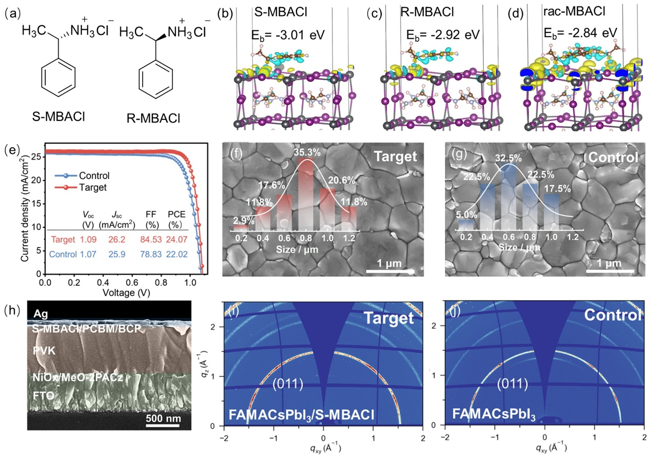 赵晋津教授课题组联合武明星教授课题组提出了一种利用手性分子钝化钙钛矿界面缺陷的策略。该研究利用手性分子R-、S-甲基苄基氯化铵盐(MBACl)钝化钙钛矿界面缺陷。其中,S-MBACl展现出较强的螯合能力与钝化效果,促进载流子传输分离,使电池效率达24.07%。器件在N2中储存2400小时后仍保持89%初始效率,稳定性能优异。该工作揭示了手性分子调控钙钛矿缺陷的作用,为开发高效手性钝化剂及优化钙钛矿太阳能电池性能提供了新思路。该成果以研究成果以“Constructing High-Performance Inverted Perovskite Solar Cells Using Chiral Organic Molecules”为题,发表在综合类权威期刊《Advanced Science》,硕士研究生尚子璇为第一作者,博士研究生韩金宝为共同第一作者,赵晋津教授和武明星教授为共同通讯作者。