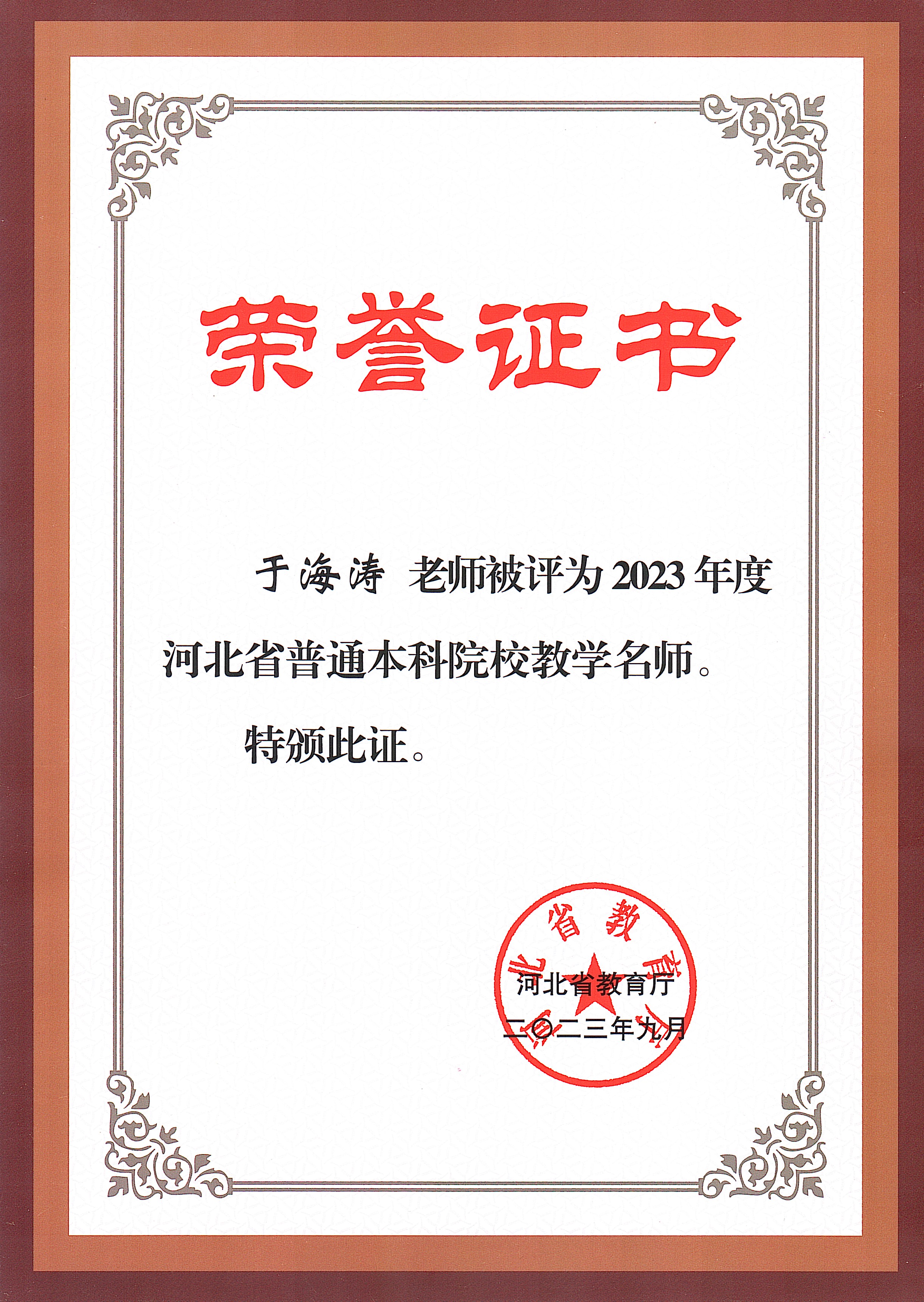 公司于海涛教授被评为2023年度河北省普通本科院校教学名师