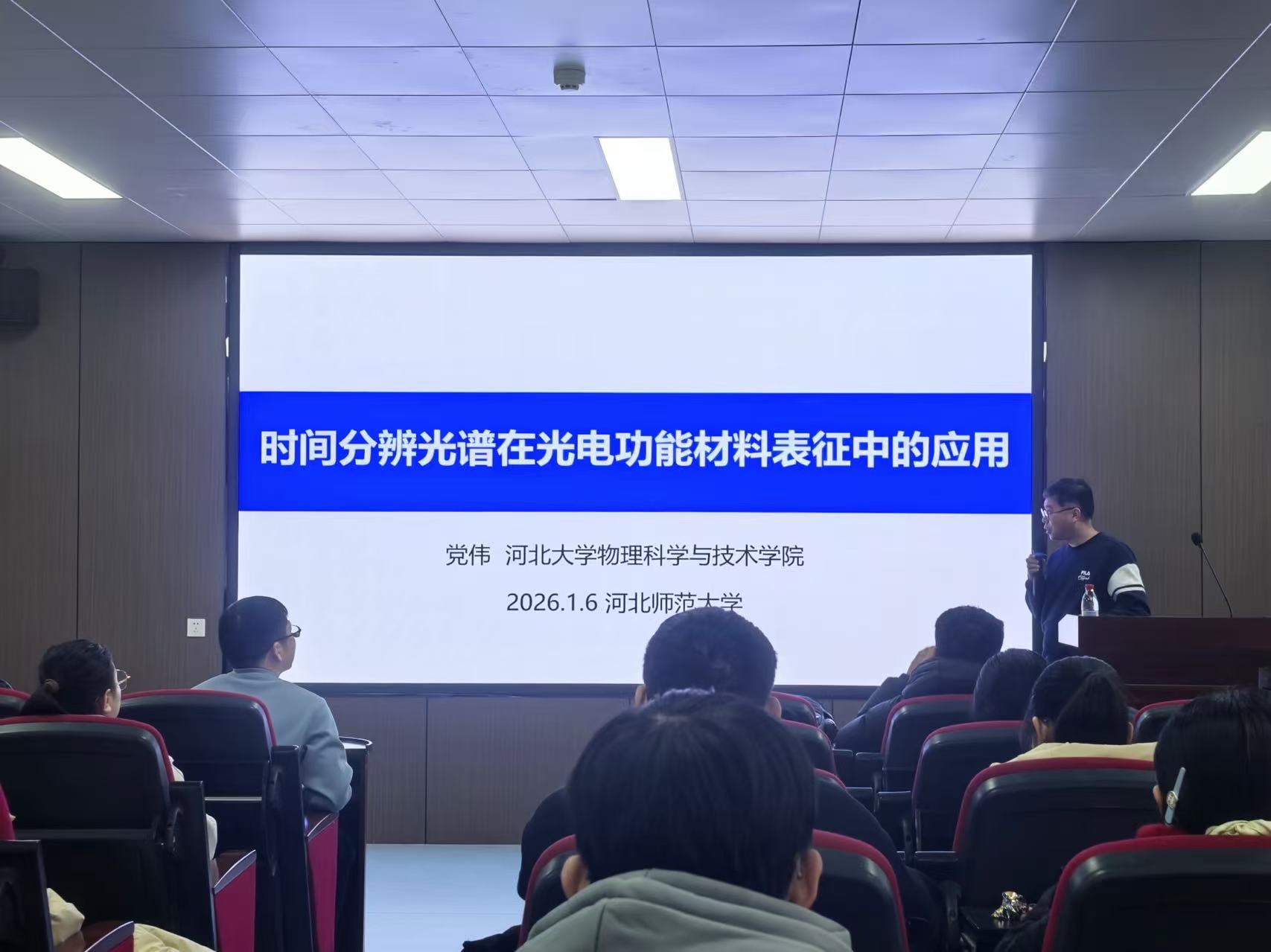 2026年1月6日上午,suncitygroup太阳新城特邀河北大学党伟副教授,于化学楼C118举办了一场题为“时间分辨光谱在光电功能材料表征中的应用”的精彩学术报告。公司教师以及研究生、本科生代表共同参与了此次报告会。